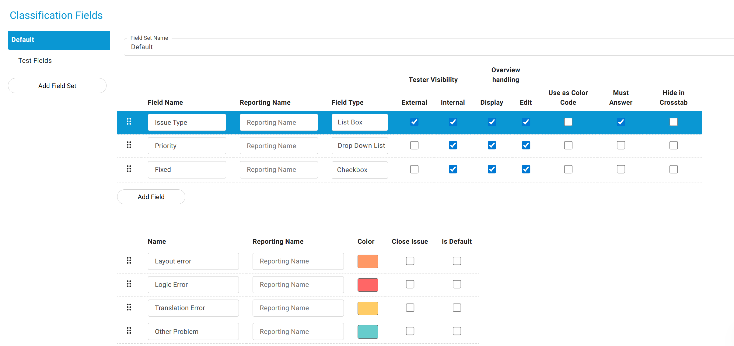 Classification Fields help structure issue reporting. Field Sets group them for projects. You control visibility, colors, defaults, and whether values can close issues.