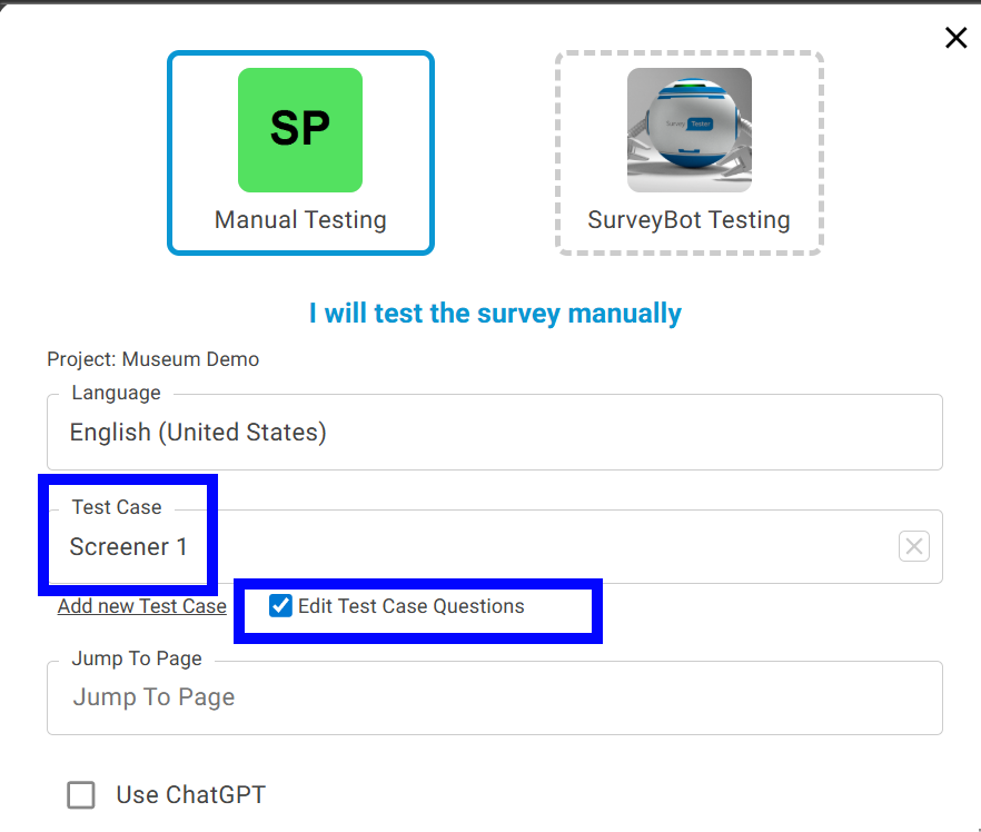 - If you want to edit existing questions or add new ones while testing, check the box labeled Edit Test Case Questions.